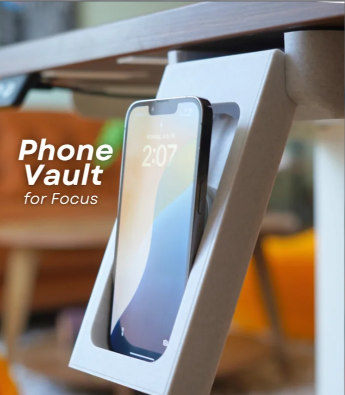 The Phone Vault is an under-desk drawer designed to help reduce distractions and improve focus during work or study. Research shows that even the presence of a phone can make it harder to concentrate — the Phone Vault provides a simple way to put your device out of sight while keeping it close by.